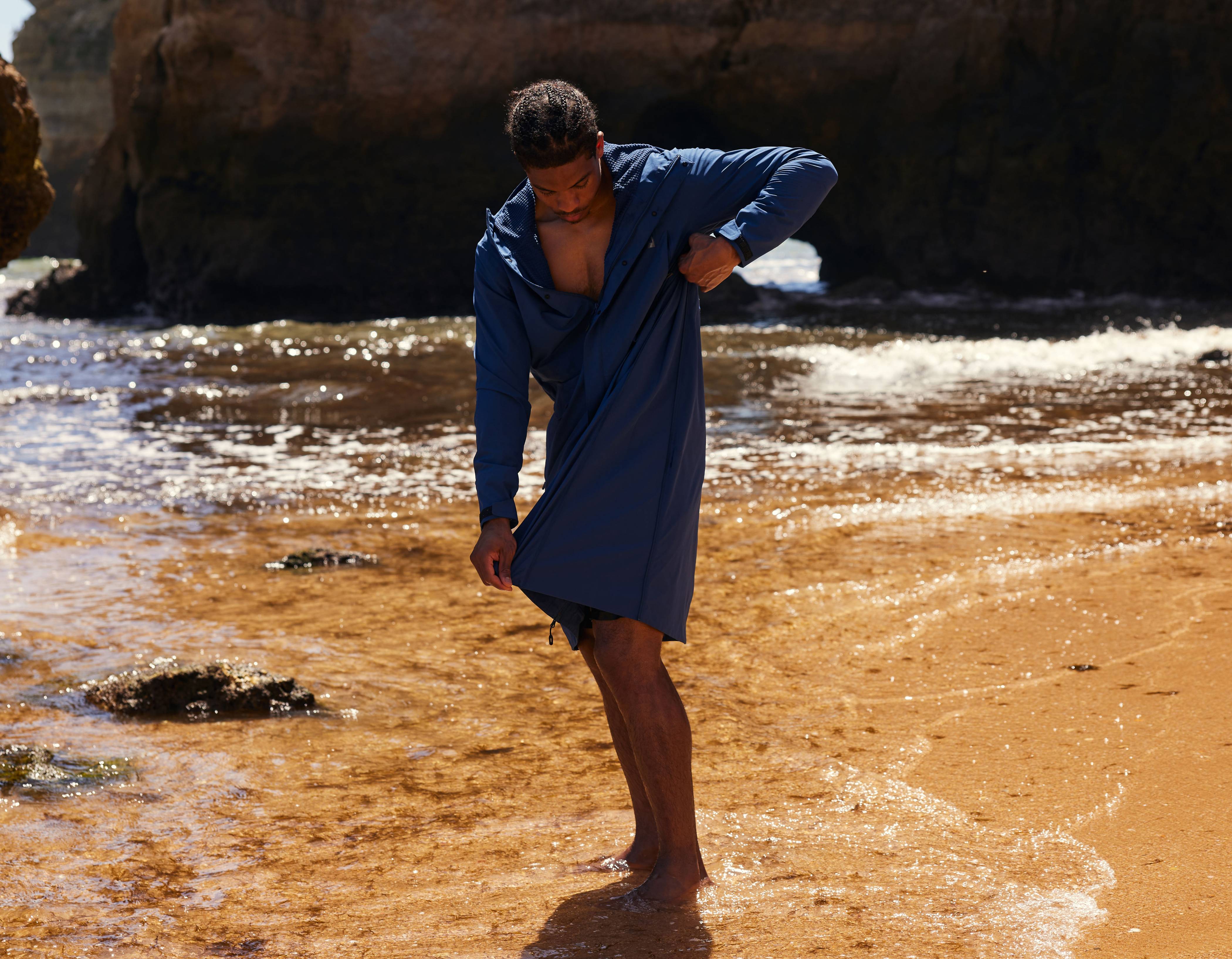 Stylish made with attention to detail and quality in mind. This technical item is a delight to wear, loaded with all the features you will find in a quality changing robe and outdoor jacket. Stylish 😎 to wear to and from the swim and on for post swim refreshments, walk or out for a casual excursion